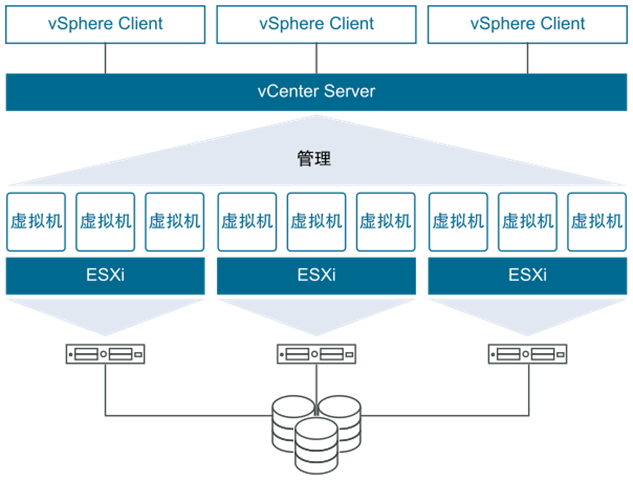 vSphere的两个核心组件是ESXi和vCenter Server。ESXi是用于创建并运行虚拟机和虚拟设备的虚拟化平台。vCenter Server是一项服务,用于管理网络中连接的多个主机,并将主机资源池化。