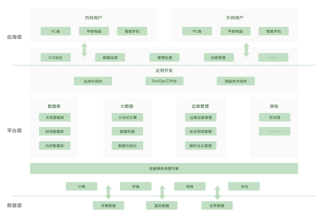 数据层:主要负责整个系统的数据采集以及存储,主要来源为现场设备采集 数据、国家发布数据、业务往来的数据等,为平台和应用形成强大的数据支撑 平台层:平台层分为IaaS层和PaaS层。IaaS层对外给予标准的符合OpenStack规范要求的REST API。对内在功能性、可靠性、安全性、支撑工具等方面全面优化开源 OpenStack,全面接入OpenStack各领域核心组件,给予完善的云基础设施服务能力,涵盖计算、存储、网络、安全等 IaaS服务,根据客户需求能够支持公有云、私有云和混合云三种不同应用模式。PaaS层:给予云计算、大数据、应用开发、中间件、人工智能、区块链等基础PaaS服务能力。顺利获得贝斯特全球奢华企业大脑产品,面向各个行业和领域,给予以数据为核心的工业数据服务、机理模型服务和业务微服务,此外还给予了面向工业设备连接的物联网服务、云化软件和APP开发服务及基于区块链技术构建的云资源管理库 应用层:顺利获得平台的搭建,主要面向石油、化工、冶金等不同行业的不同业务流程,给予GIS定位、数据监测、警情处理、设备管理等相关的应用,为相关人员随时随地关注安全状况和污染情况,对企业全方面的有效管理