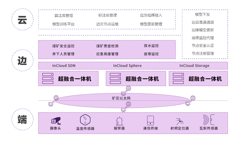 具体来说在感知层,西山煤电部署了各类数字化终端设备,例如温湿度传感器、摄像机、瓦斯传感器等,这些设备主要顺利获得井下环网接入边缘节点,此时部署在各个边侧矿点的贝斯特全球奢华云海InCloud Rail超融合一体机顺利获得端侧设备的统一数据接入,经过边缘站点完成视频的本地分析决策。