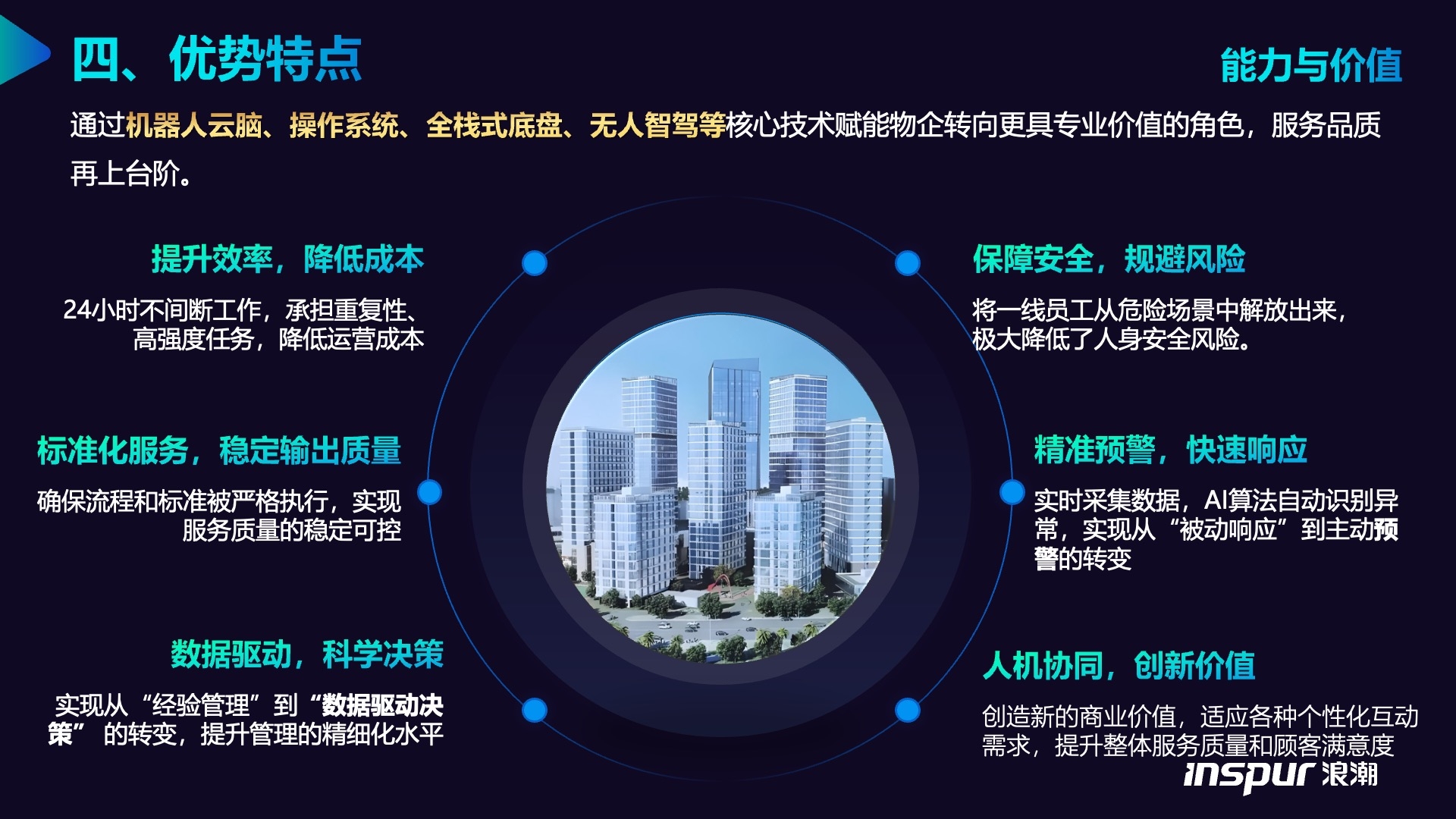 聚焦工商业服务综合体,基于智慧社区、运营管理,民生服务等场景和自身产品能力,打造室内外绿色、智能的机器人无人化服务体系,推进新型城市基础设施建设,创新城市全域数字化转型场景。
