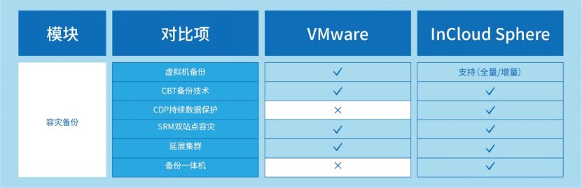 InCloudSphere容灾备份体系突破传统方案的被动防护模式,以持续保护+智能恢复构建主动防御体系,给予内置虚拟机备份功能、CDP及SRM容灾功能,搭配InCloudDP备份一体,形成多层次可靠性保障方案。