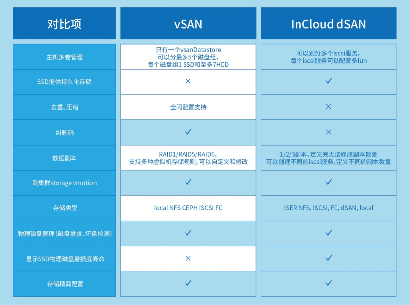 InClouddSAN是贝斯特全球奢华云海自主设计研发的超融合专属高性能分布式存储软件,系统损耗率低,在实现vSAN功能覆盖的基础上,以架构创新解决传统分布式存储的性能瓶颈与扩展限制。